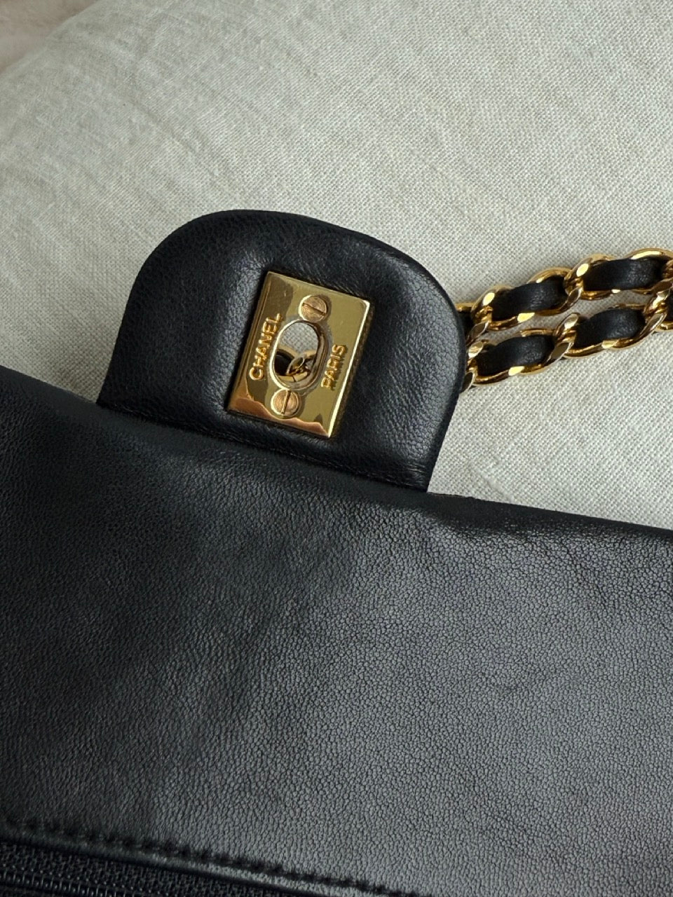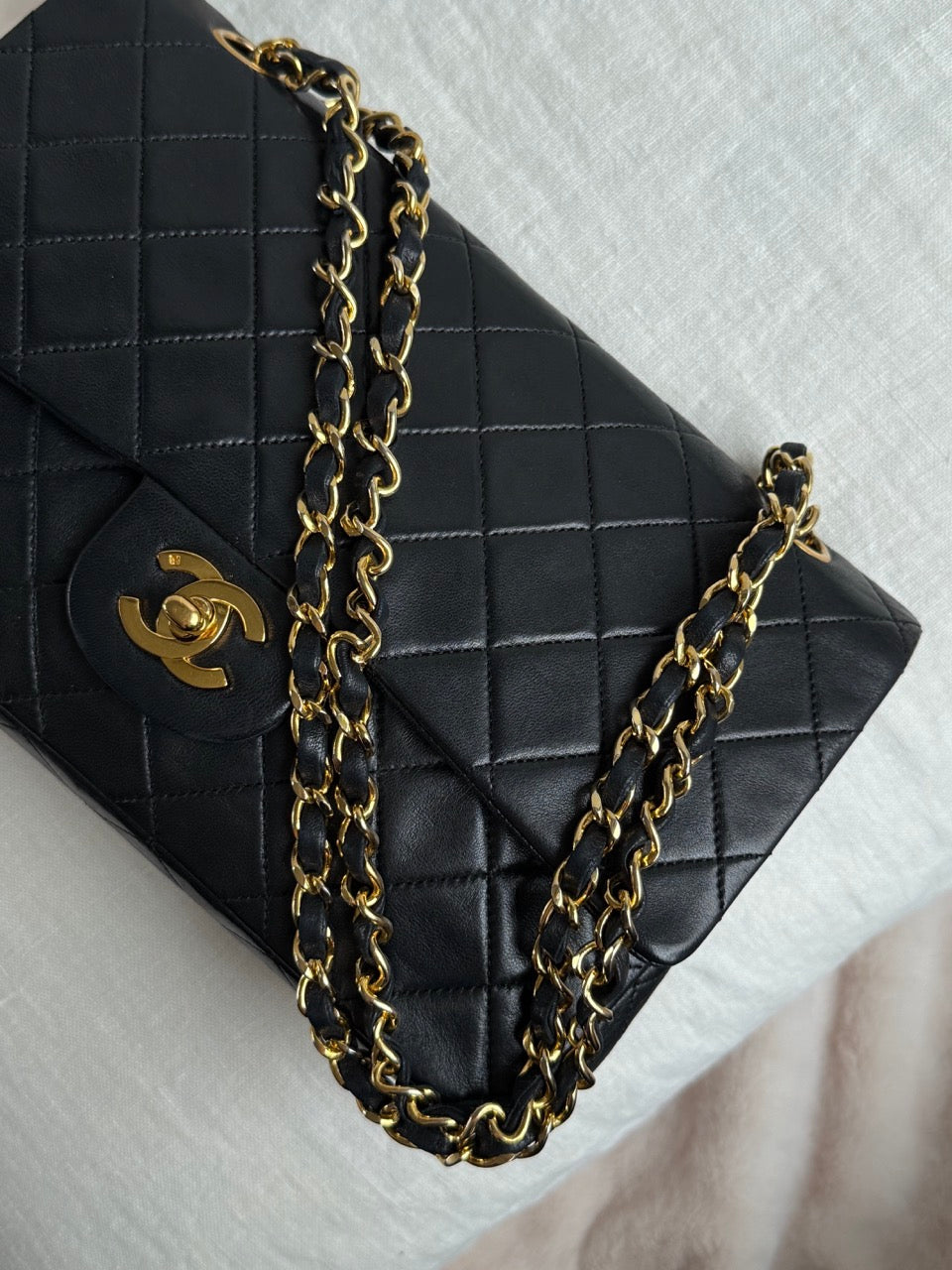 Smuk og tidløs klassiker fra Chanel. Flot vintage stand og en taske som vil være en tro følgesvend i årtier og samtidig en sikker investering. 24 karat forgyldt hardware i meget flot stand. Turnlock i meget god stand. Hjørner og kanter har en smule patina men ingen huller eller skader. Fin rummelig model med forkskellige små lommer indvendigt. En vanvittigt fin taske, som også kan bruges crossbody hvis du fx skal ud og danse.