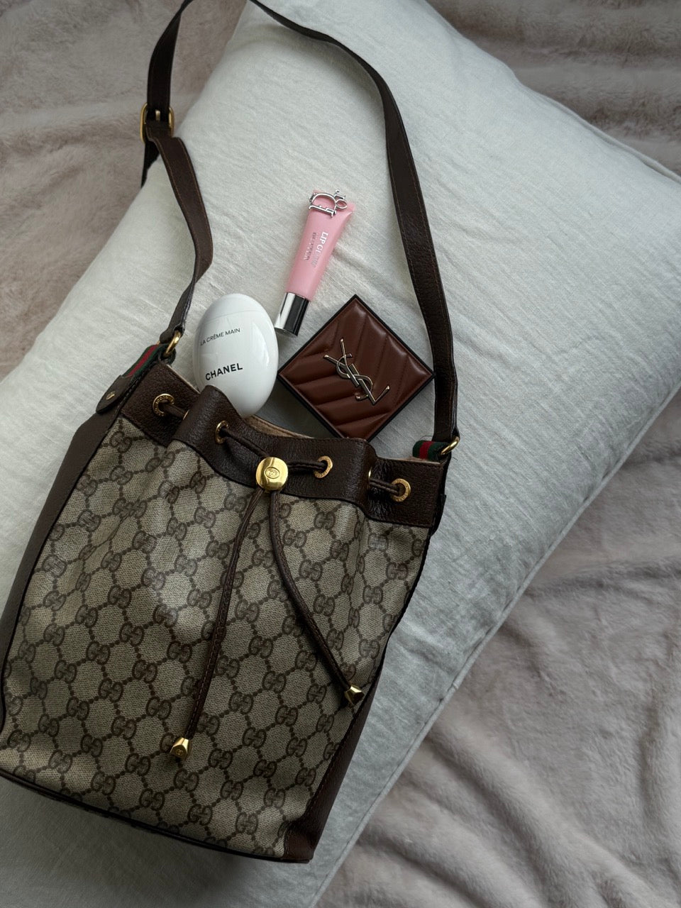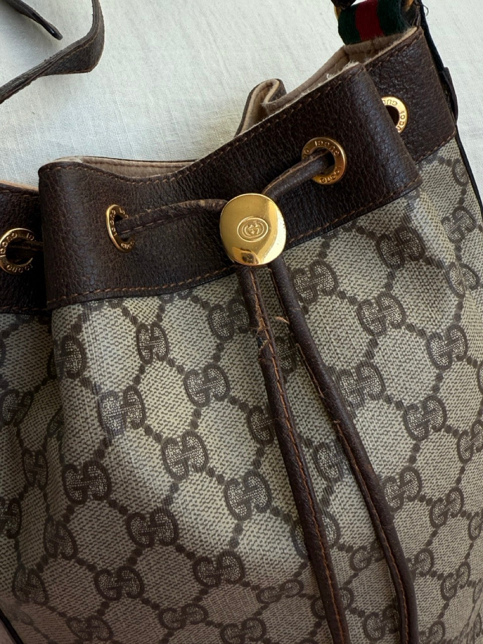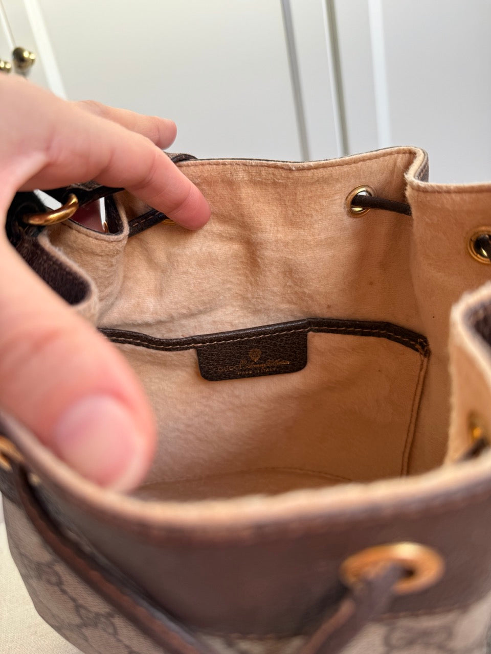 Smuk, vintage bucket bag fra Gucci. Klassisk model som er både cool, praktisk og rummelig. Ikonisk monogram canvas, som er yderst slidstærkt og nemt at tørre over med en fugtig klud. Flot stand men tasken var krakkeleret på indersiden, så den er renset og fremstår nu som blødt stof. Har en lille skade på snoren men ellers fin vintage stand. Kan bruges crossbody og har justerbar skulderrem.
