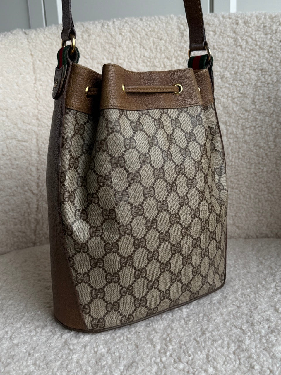 Smuk, vintage bucket bag fra Gucci. Klassisk model som er både cool, praktisk og rummelig. Ikonisk monogram canvas, som er yderst slidstærkt og nemt at tørre over med en fugtig klud. Flot stand men tasken var krakkeleret på indersiden, så den er renset og fremstår nu som blødt stof.