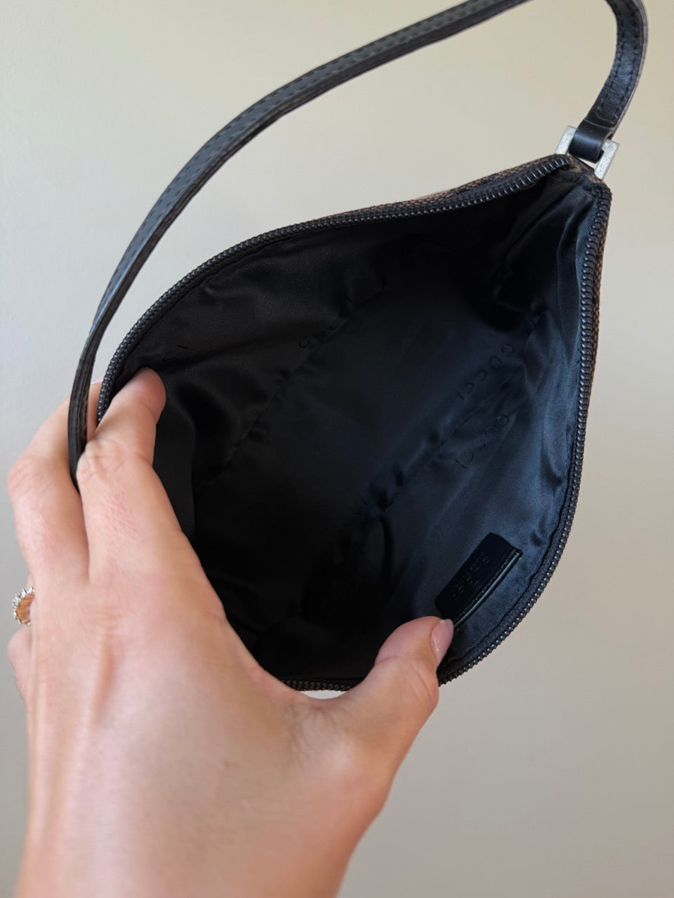 Fineste lille Gucci taske i mørkebrunt canvas. Kan fint rumme fx både kort, telefon, nøgler og lidt make-up. Rigtig fin vintage stand med enkelte små brugsten på remmen. Ekstra aftagelig kæde følger med (se sidste billede) så den kan bruges crossbody. Kæden er 120 cm men kan sagtens tilpasses. Skriv gerne en kommentar til din ordre med den ønskede længde.