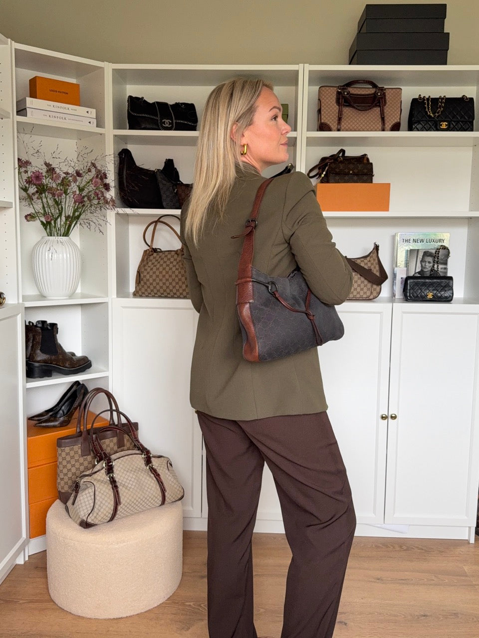 Smuk, klassisk taske fra Gucci i blød, mørk læder og canvas. Læder- og metaldetaljer giver tasken et cool udtryk. Super rummelig og med ekstra lynlåslomme indeni. Flot vintage stand men har let slid øverst på canvas hvor tasken åbnes og lukkes.