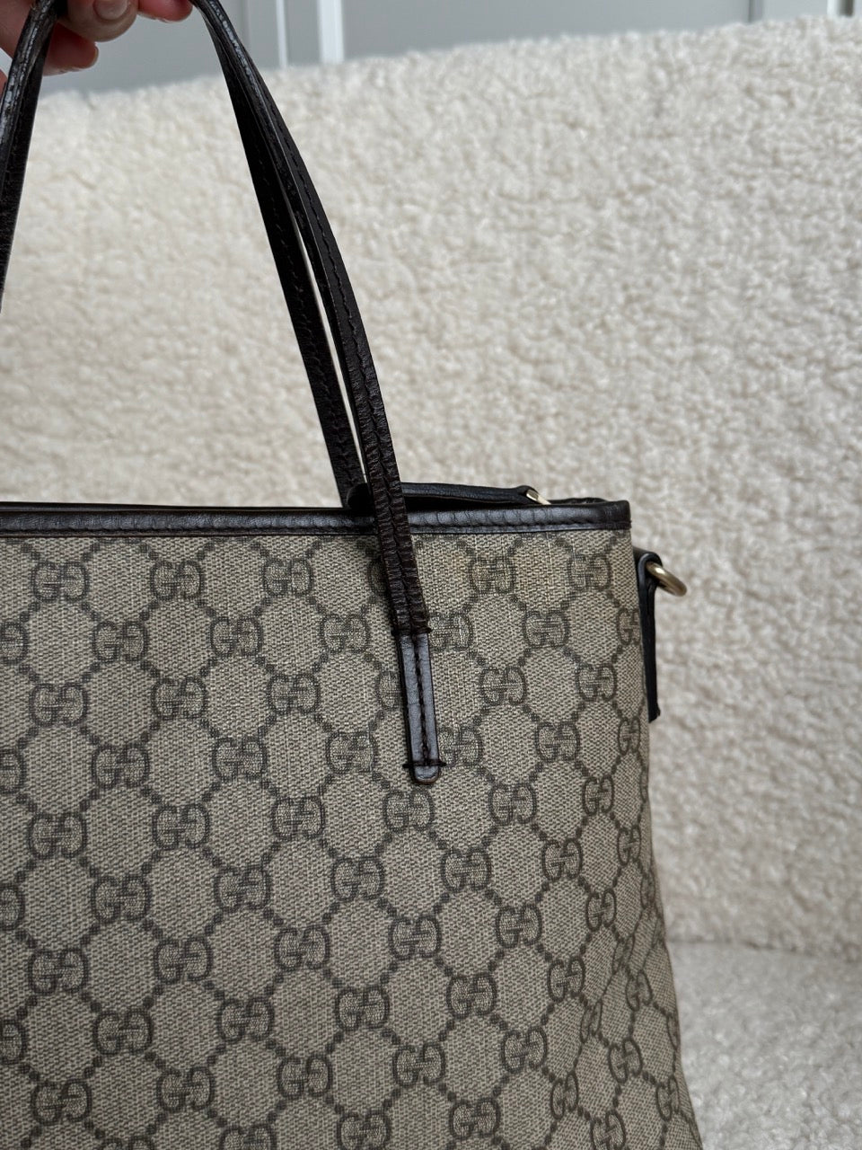 Fineste taske fra Gucci i klassisk monogram. Mørkebrune detaljer og lynlås-lukning. Gode lommer indvendigt og en dejligt rummelig model. Der er mulighed for at sætte en rem på så den kan bruges crossbody. Skriv gerne en mail eller over instagram hvis du vil købe en med af mig.