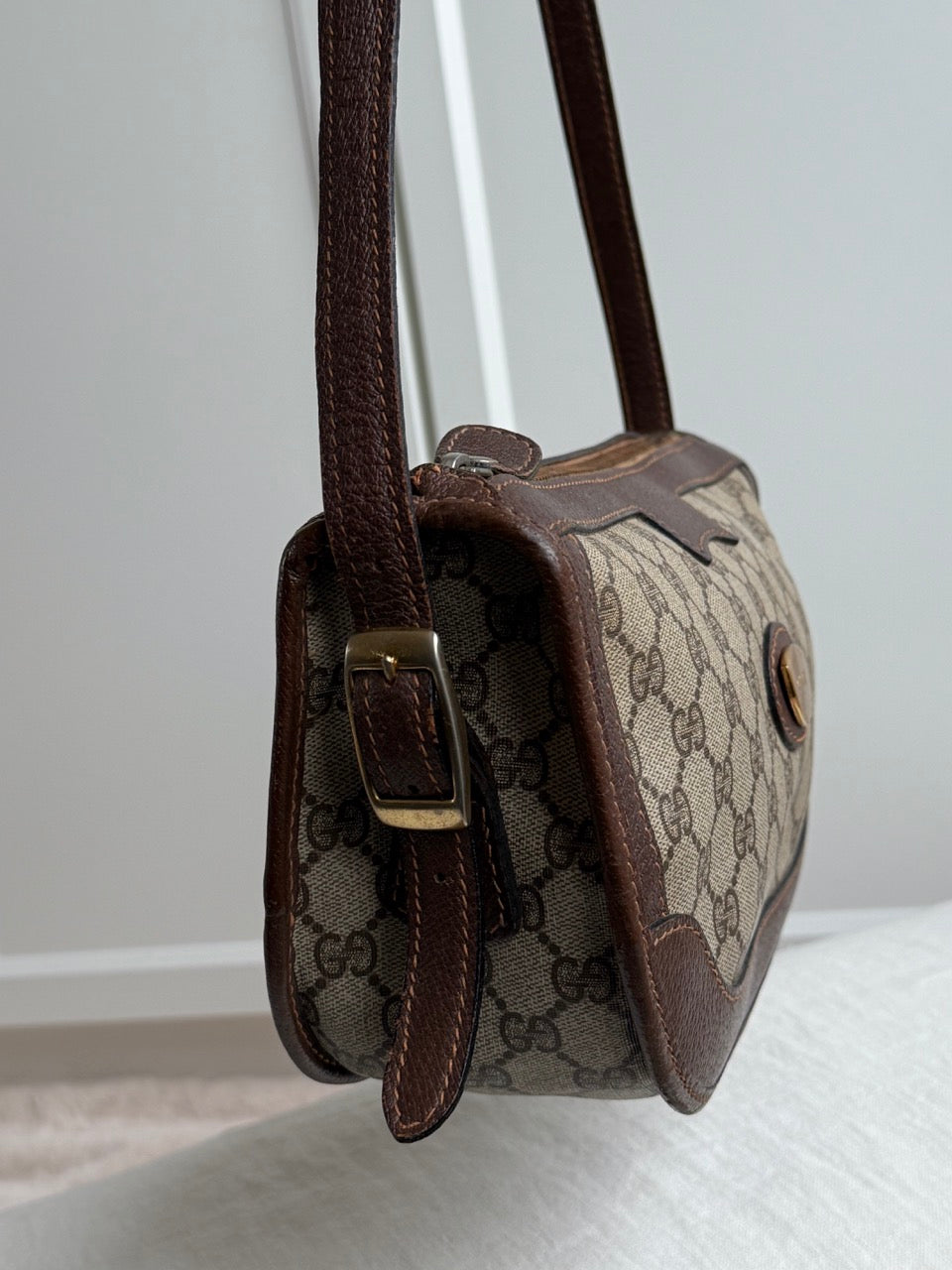 Den perfekte vintage taske fra Gucci i ikonisk monogam og smukke, brune læderdetaljer. Sidder godt over skulderen og er meget slidstærk i coated cavas. Flot vintage stand. Lynlåsen har patina men fungerer 100% som den skal. Se billeder for alle detaljer. Fin indvendig stand.