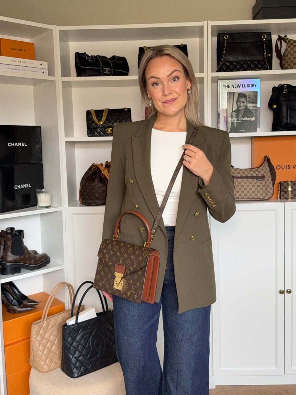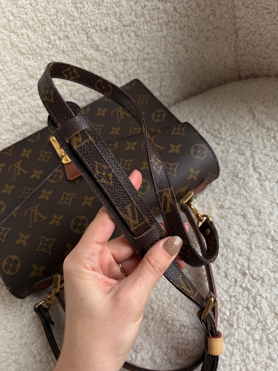 Smuk, klassisk vintage taske fra Louis Vuitton. Perfekt til både hverdag og finere brug. Der er tilføjet en helt ny, justerbar skulderrem (aftagelig) med monogram som alene har en værdi af 2500,-. Remmen kan bruges på alle tasker.